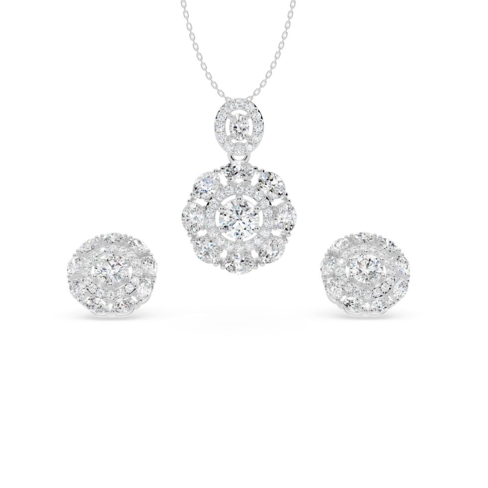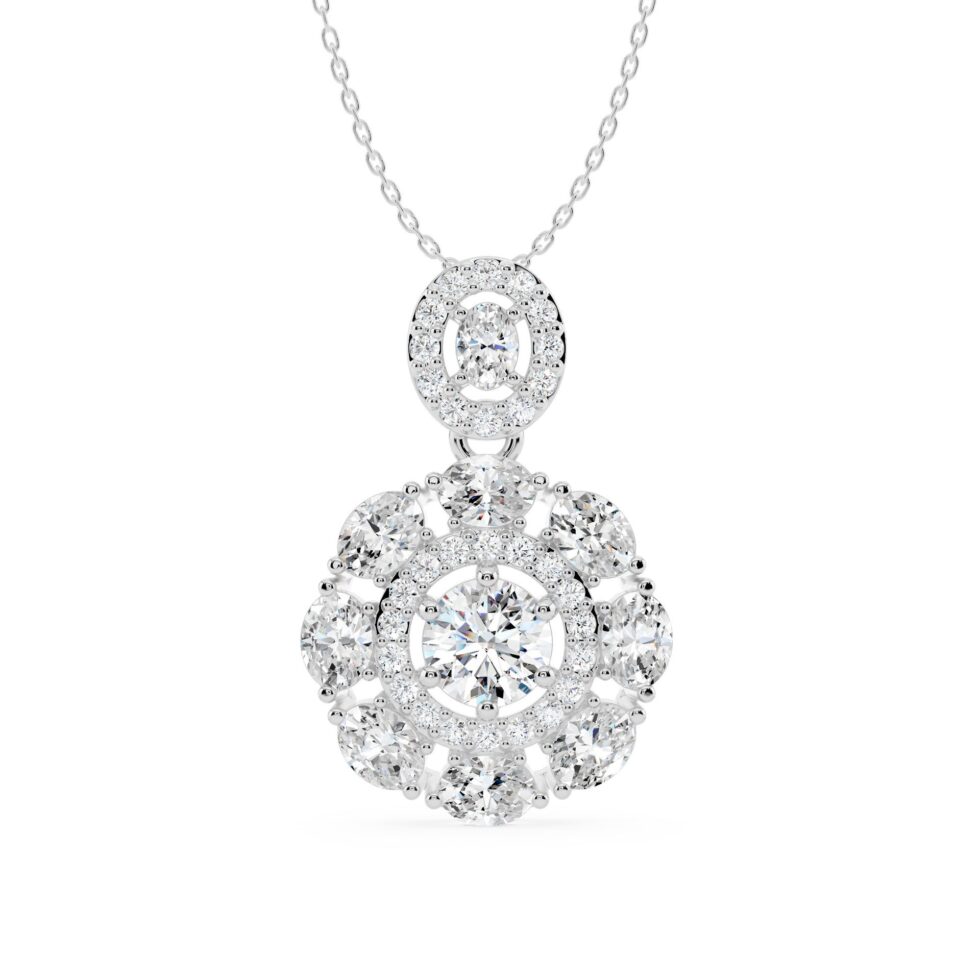 The Charming Floral Diamond Pendant Set in 14kt & 18kt gold is a breathtaking expression of beauty and brilliance. Expertly crafted in your choice of white, yellow, or rose gold, this elegant set features round and oval diamonds with a total weight of 3.80 carats, highlighted by a dazzling 0.50-carat solitaire. With superior E-F color and VVS-VS clarity, the floral-inspired design captures light effortlessly, making it the perfect choice for weddings, celebrations, and timeless gifting.