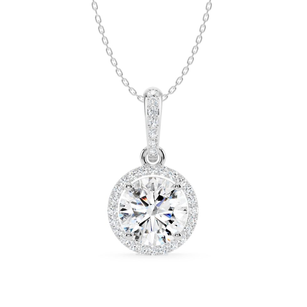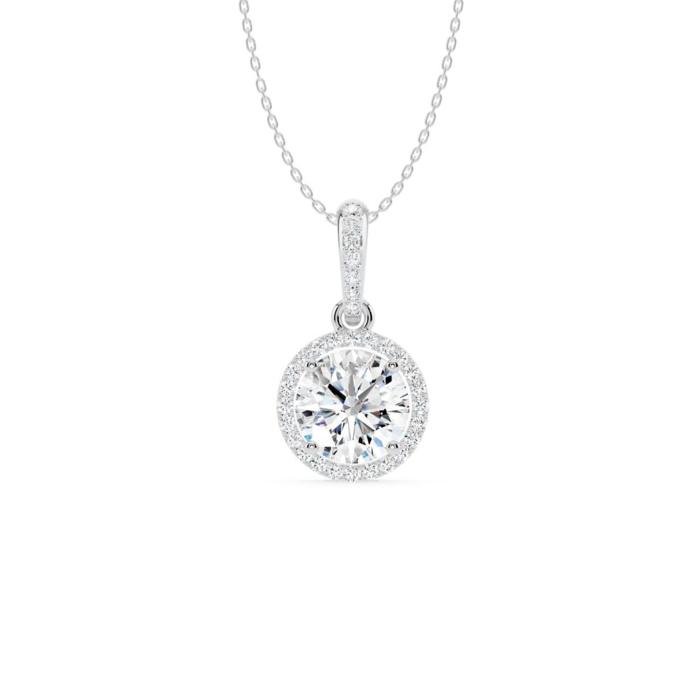 Halo Round Solitaire Pendant – Radiate timeless brilliance with this exquisite halo-style diamond pendant. Expertly crafted in Yellow Gold, White Gold, or Rose Gold, it features a stunning 1.50-carat round solitaire surrounded by a halo of brilliant diamonds, bringing the total diamond weight to 1.70 carats. With exceptional E-F color and VVS-VS clarity, this pendant captures pure sparkle and sophistication. A perfect gift for birthdays, anniversaries, or special milestones, the Halo Round Solitaire Pendant embodies classic beauty and lasting elegance.