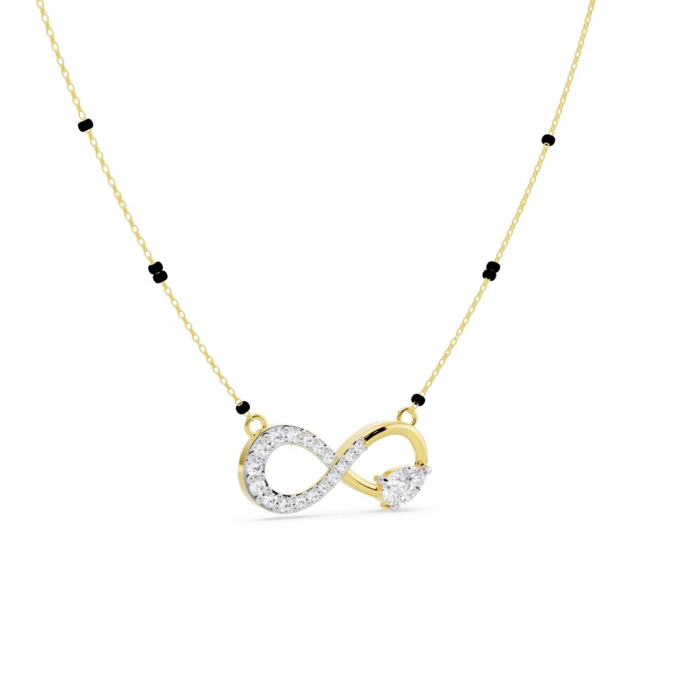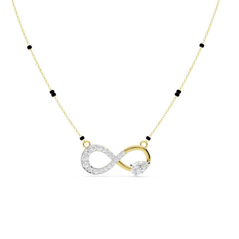Infinity Diamond Mangalsutra – Celebrate eternal love with this exquisite Infinity design Mangalsutra, crafted in Yellow Gold and adorned with Round and Pear-shaped diamonds totaling 0.46 carat. Each diamond sparkles with E–F color and VVS–VS clarity, symbolizing purity and endless connection. A perfect fusion of modern style and timeless tradition, this diamond mangalsutra adds a graceful sparkle to your everyday elegance.