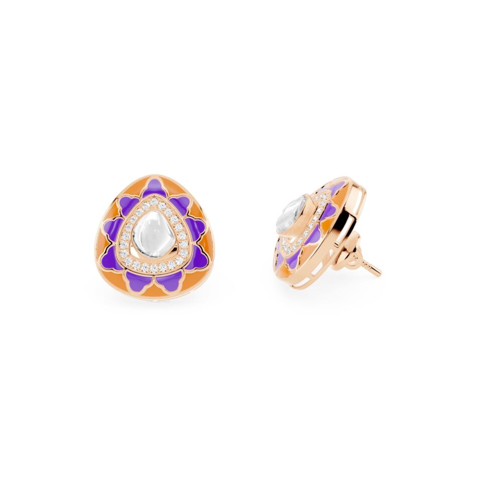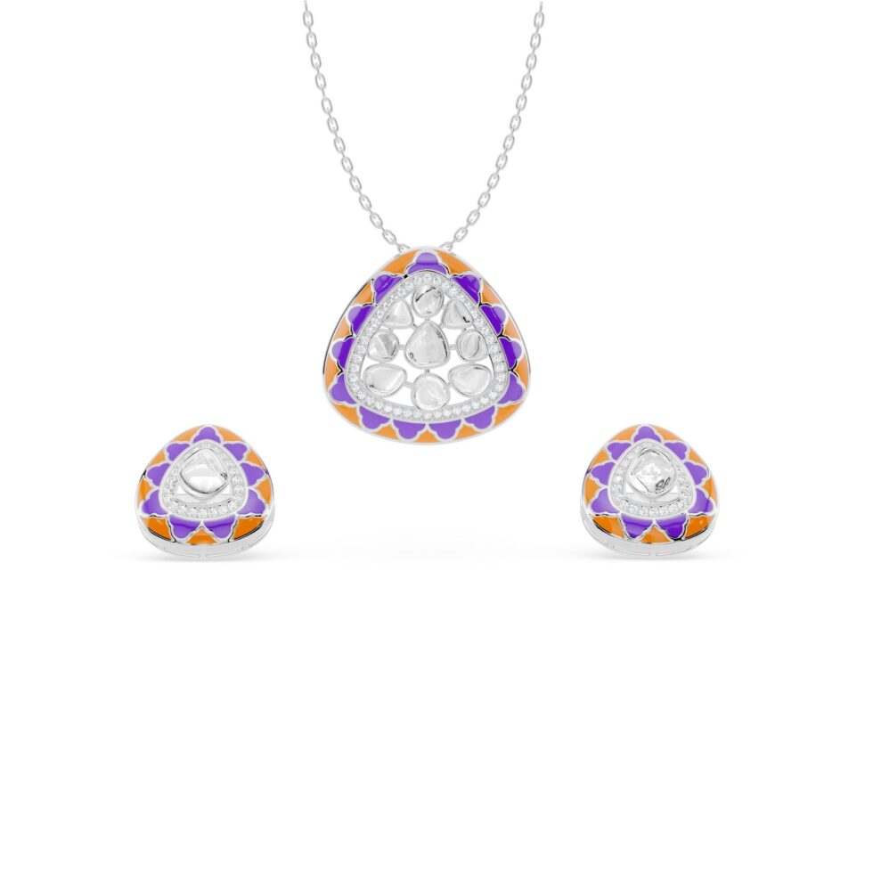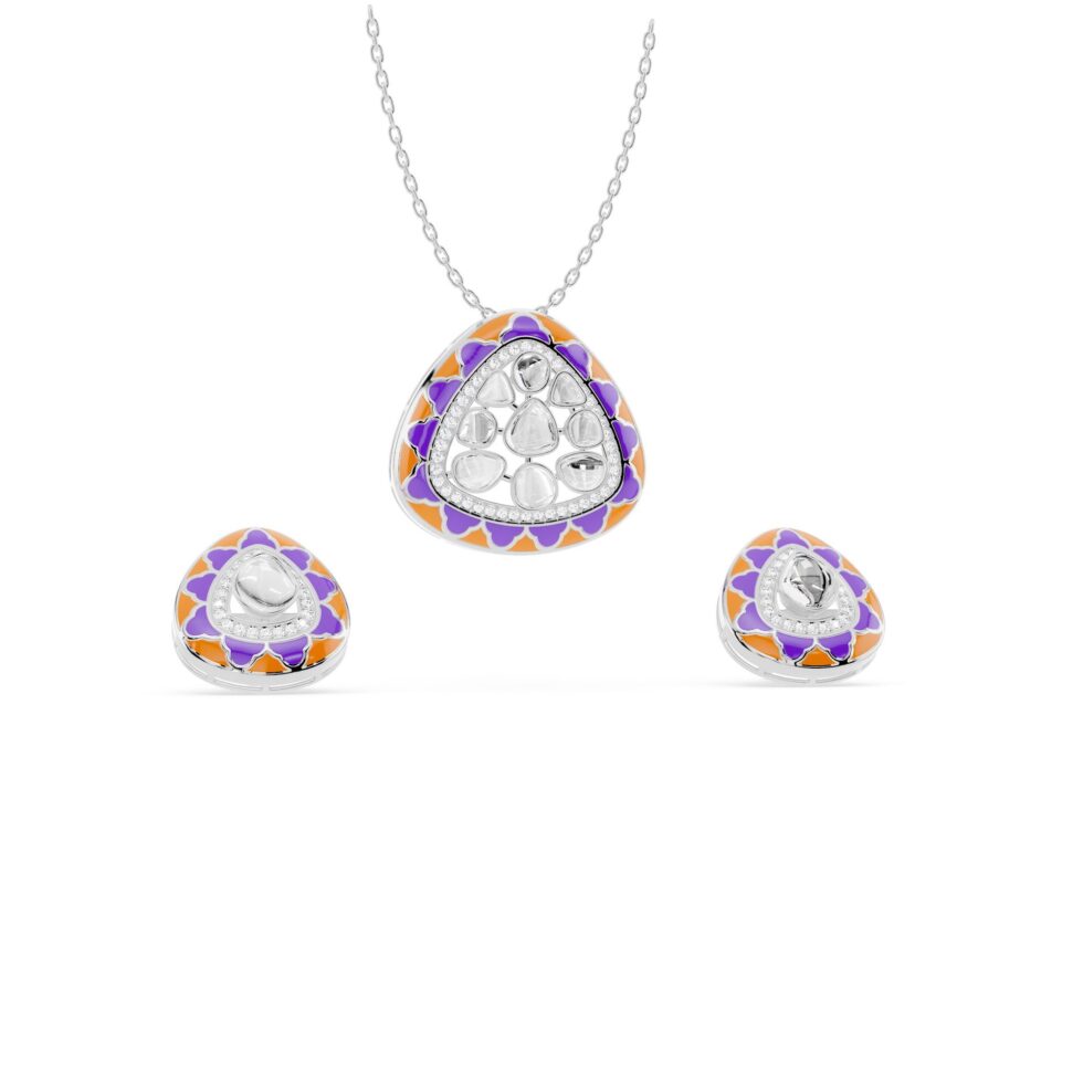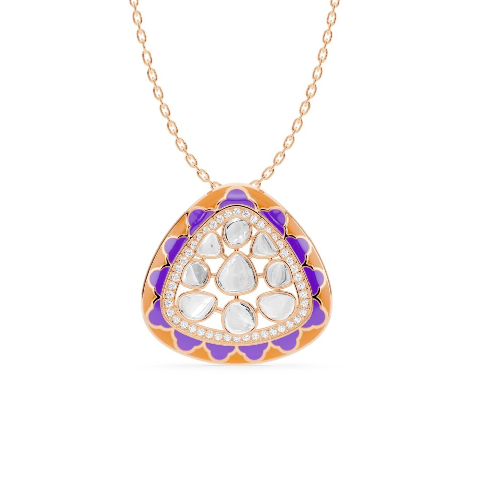 Embrace regal sophistication with the Ishvani Enamel Polki Pendant Set, a masterpiece that blends heritage charm with modern grace. Handcrafted in Yellow, White, and Rose Gold, this exquisite set features round Polki weighing 4.50 carats, accentuated by brilliant-cut diamonds totaling 0.75 carat of E-F color and VVS-VS clarity. The delicate enamel detailing adds a vibrant artistic touch, making it the perfect statement for weddings, celebrations, and timeless elegance.