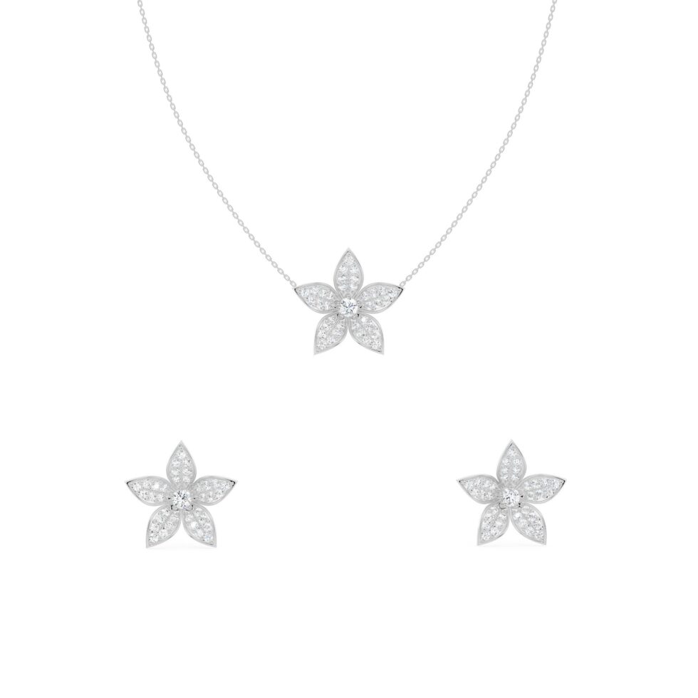 The Morning Petal Diamond Pendant Set in 18kt & 14kt gold beautifully captures the freshness and charm of a blooming flower. Crafted in your choice of white, yellow, or rose gold, this elegant set features a delicate floral design adorned with round diamonds totaling 1.85 carats. With superior E-F color and VVS-VS clarity, the diamonds sparkle with radiant brilliance, making this pendant set a perfect blend of grace and sophistication for any special occasion.