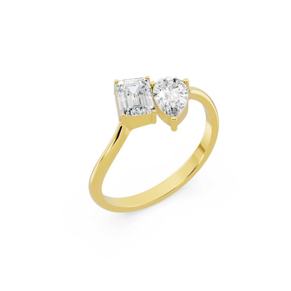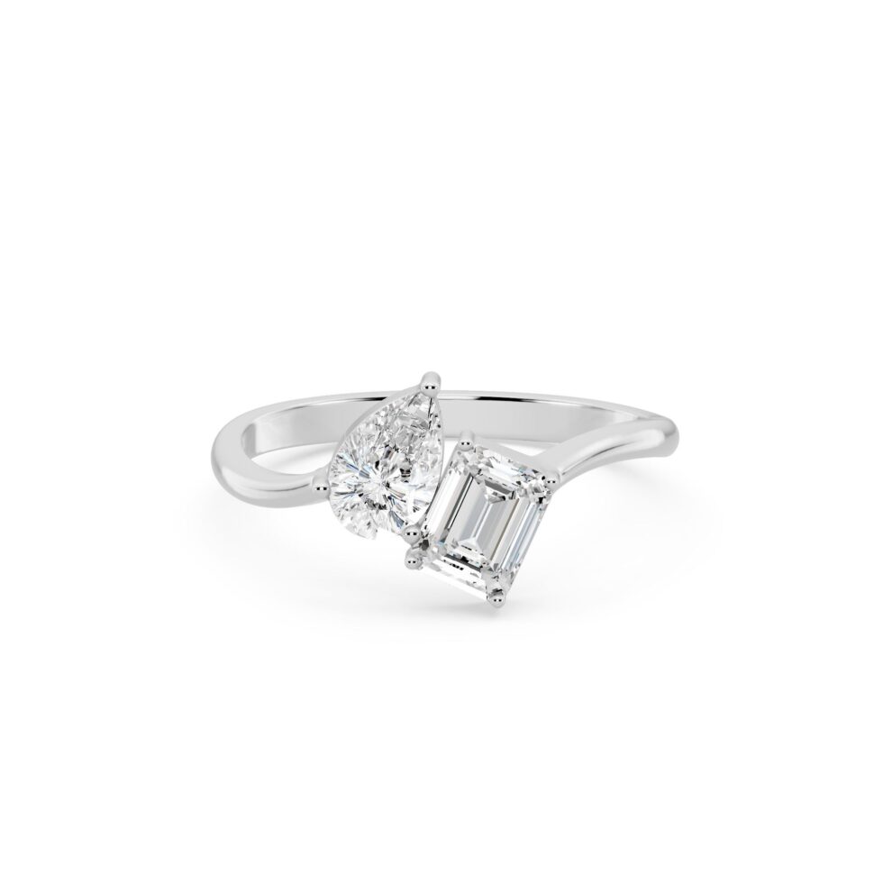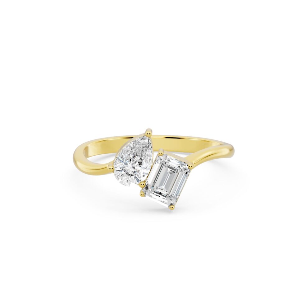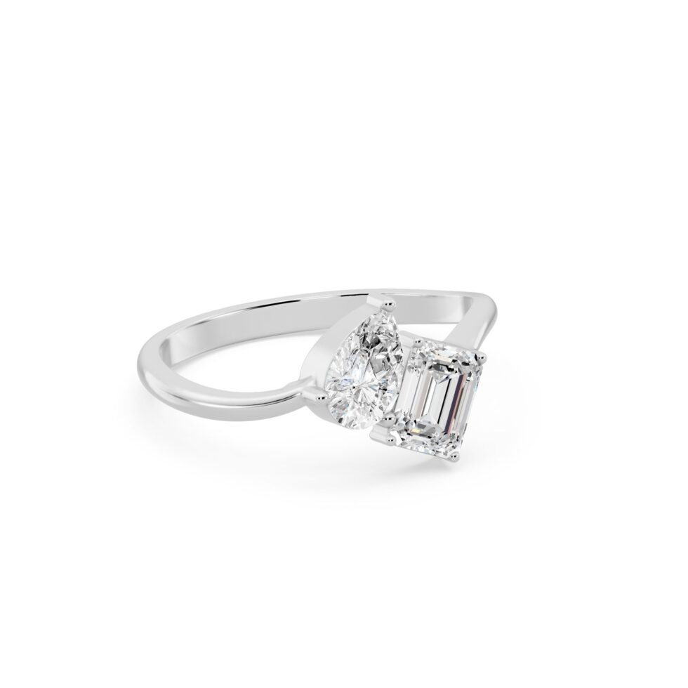Embrace timeless romance with the Pear & Emerald Toi Et Moi Diamond Ring, symbolizing two souls united in brilliance. This elegant solitaire ring features Pear and Emerald-cut diamonds totaling 1.25 carats, crafted in luxurious Yellow Gold, White Gold, or Rose Gold. With E-F color and VVS-VS clarity, each diamond radiates exceptional sparkle and sophistication — a perfect blend of modern design and everlasting love.