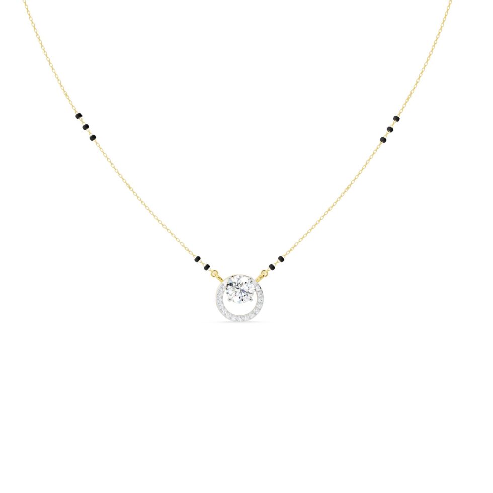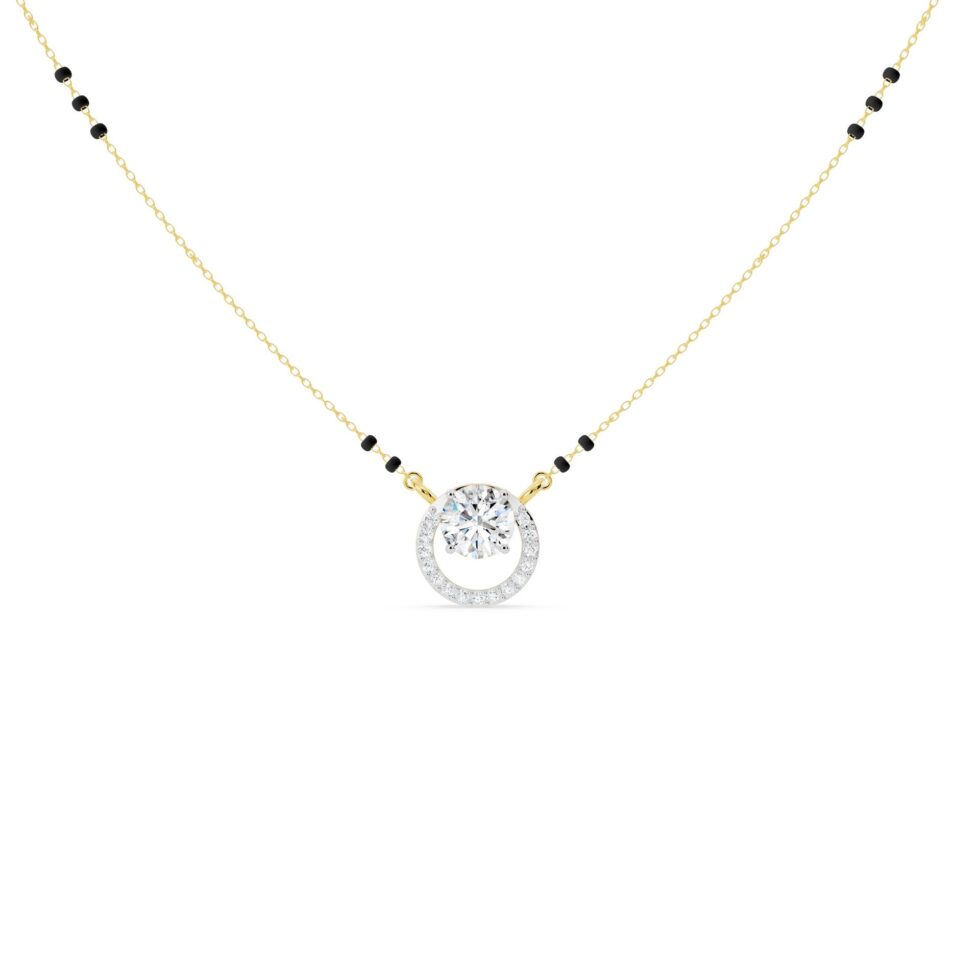 The Round Diamond Spiral Mangalsutra features a graceful spiral design adorned with sparkling round-cut diamonds. Symbolizing eternal love and unity, it beautifully blends tradition with modern elegance. A perfect choice for the contemporary bride.